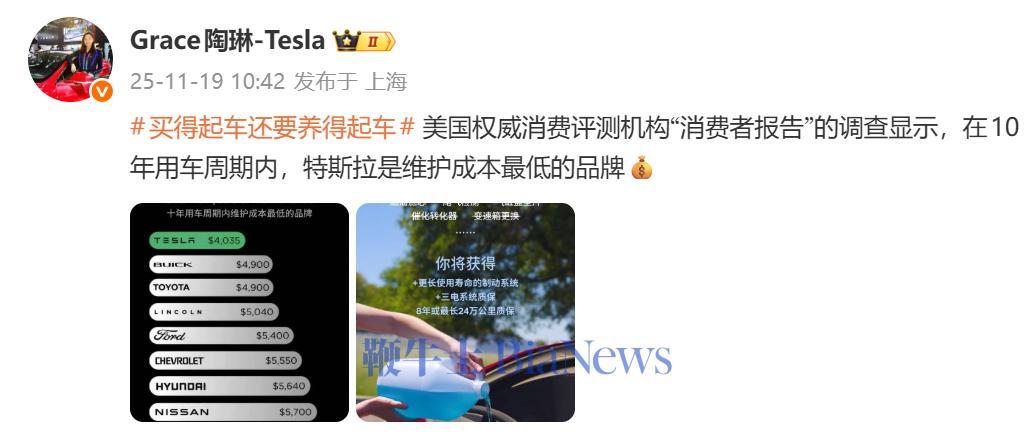 今日,特斯拉副总裁陶琳发文称,据美国权威消费评测机构“消费者报告”的调查显示,在10年用车周期内,特斯拉是维护成本最低的品牌。