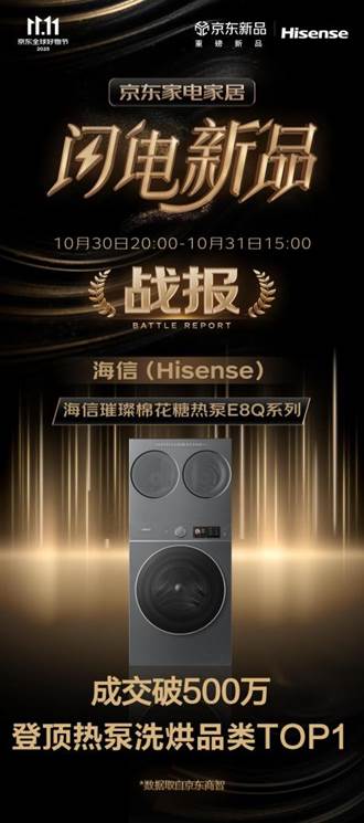 今年“双十一”大促期间,海信洗衣机交出一份亮眼的成绩单。在京东双十一战报中,在10月30日20:00-10月31日15:00,海信璀璨棉花糖热泵E8Q系列成交破500万,登顶热泵洗烘品类TOP1!展现出在消费升级趋势下,技术创新对市场格局的深刻影响。