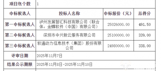 11月7日,项目中标候选人公示,三家候选人报价相近,差距不大。其中,软通动力报价最低,为2498万元,排在第三位;深圳市中兴新云服务有限公司报价最高,为2510万元,接近最高限价。