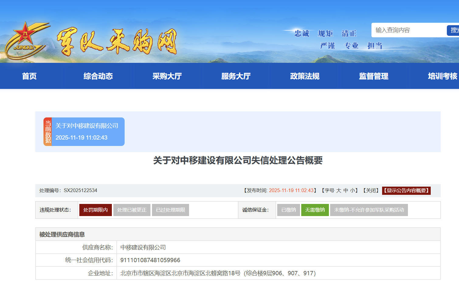 C114讯 11月19日消息(颜翊)今日,军采网发布《关于对中移建设有限公司失信处理公告》。