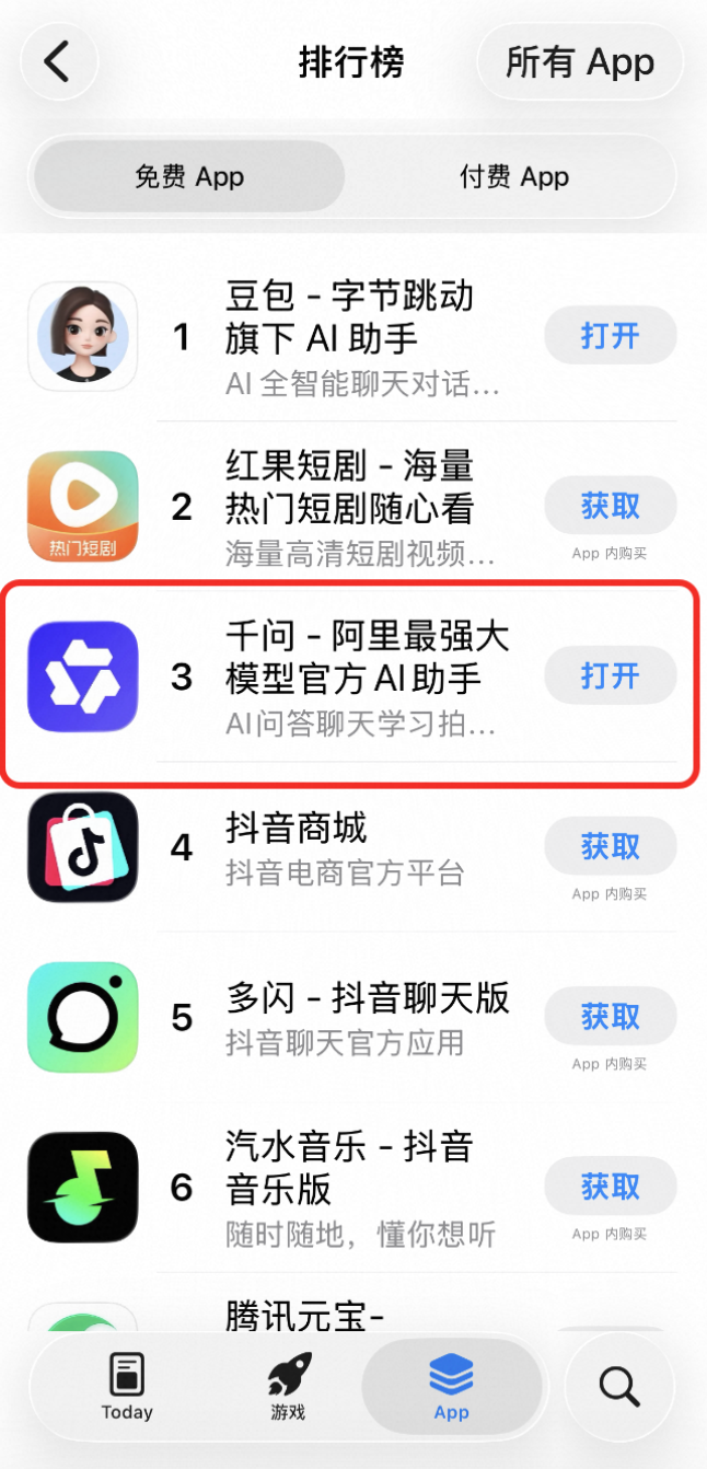 11月19日,记者获悉,阿里巴巴新推出的AI应用“千问APP”,在公测上线仅两天后,已成功冲入苹果App Store免费应用总榜第三位。