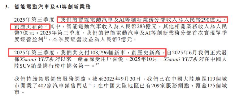 智能电动汽车及AI等创新业务成为最大亮点,单季度收入达290亿元,同比增长199.2%,创历史新高,且首次实现单季度经营盈利,经营收益7亿元。