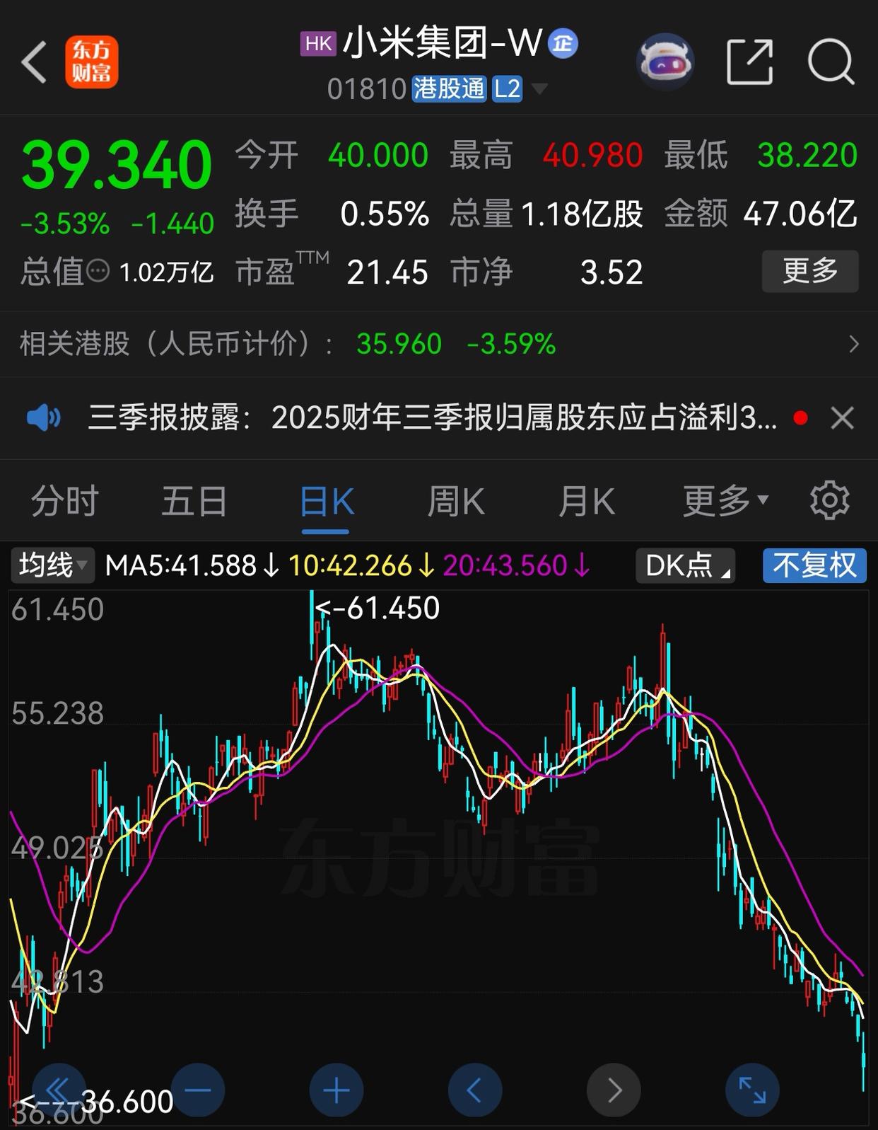 这一走势延续了小米下半年以来的下行态势。自6月27日创下61.45港元的年内股价高点后,小米股价累计跌幅已超30%,市值随之大幅缩水。值得注意的是,此次股价走弱发生在其第三季度亮眼财报发布的次日——即便财报核心数据表现强劲,仍未能扭转市场抛售情绪。