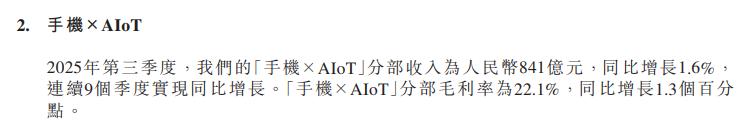 业务分部来看,2025年第三季度,小米集团手机×AIoT分部收入为人民币841亿元, 同比增长1.6%。