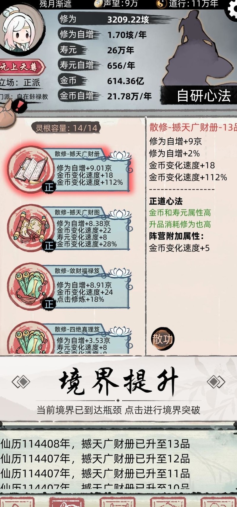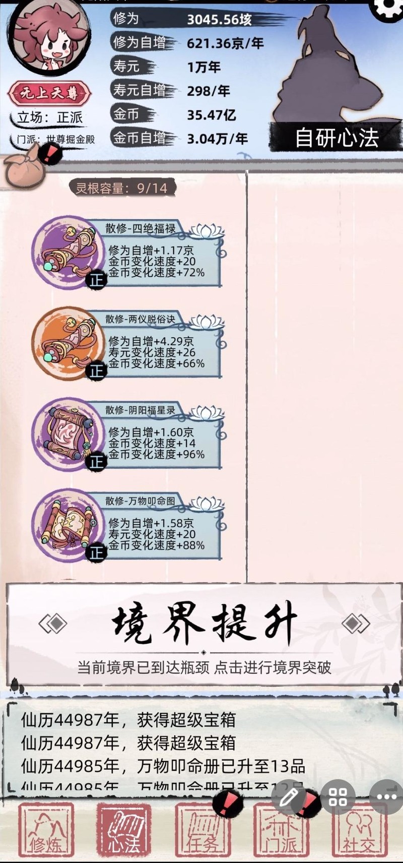 确保只修炼正道功法后,即可刷新任务以领取奖励宝箱(不受门派立场限制),宗门贡献亦可兑换宝箱,持续替换全身功法,直至全部升级为高额金钱加成的紫色、橙色功法。