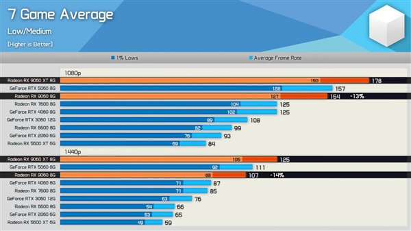 在7款游戏的平均测试中,以1080p低到中等设置运行,RX 9060达到了154 fps,1440p下为107 fps,这一结果仅比竞争对手RTX 5060(平均157 fps/111 fps)慢了几个百分点。