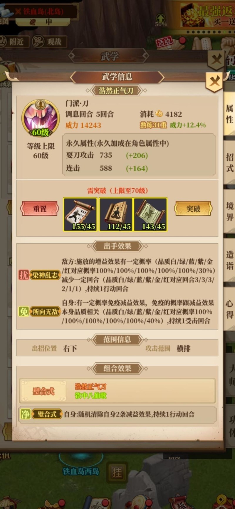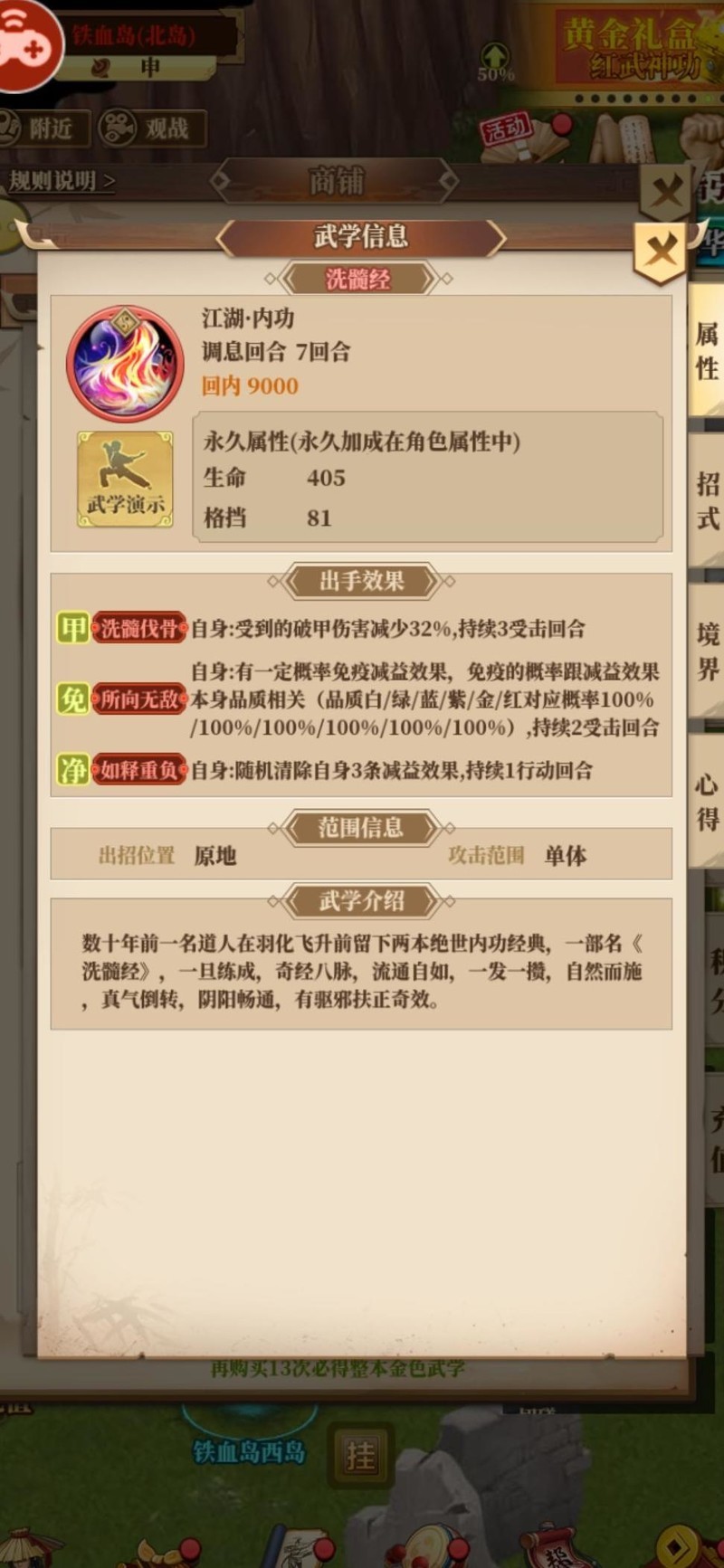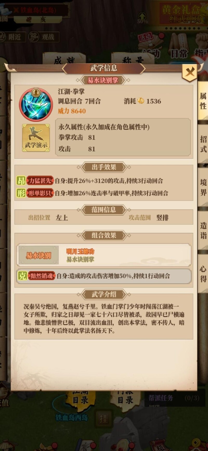 连击率与破甲率应优先考虑,高连击意味着更多技能触发与输出机会,而随着游戏进程推进,玩家防御能力逐步提升(如武学加成、宝石镶嵌),破甲的价值随之显著增强,越到后期优势越明显。其次,攻击力提升至关重要,尤其是百分比增加攻击的效果(如力猛甚先类金招),在普遍堆攻的环境下收益突出。此外,直接提升最终伤害的技能(如以半击倍)也极具价值。系别攻击增益(如剑抱七星)虽收益稍低,但仍具辅助作用。综合来看,若一门武学能具备上述两项关键属性且数值达标,即可胜任工具型武学角色;若兼具三项以上,则堪称顶尖辅助之选。