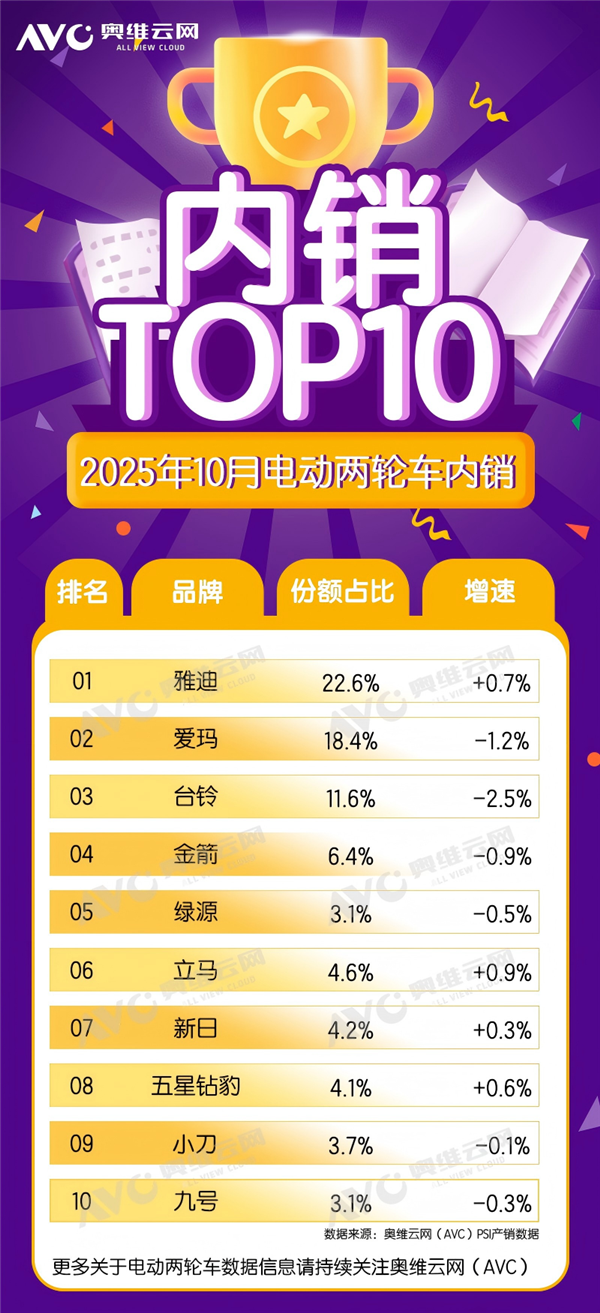 快科技11月20日消息,今天,奥维云网最新发布了2025年10月电动两轮车内销TOP10榜单。