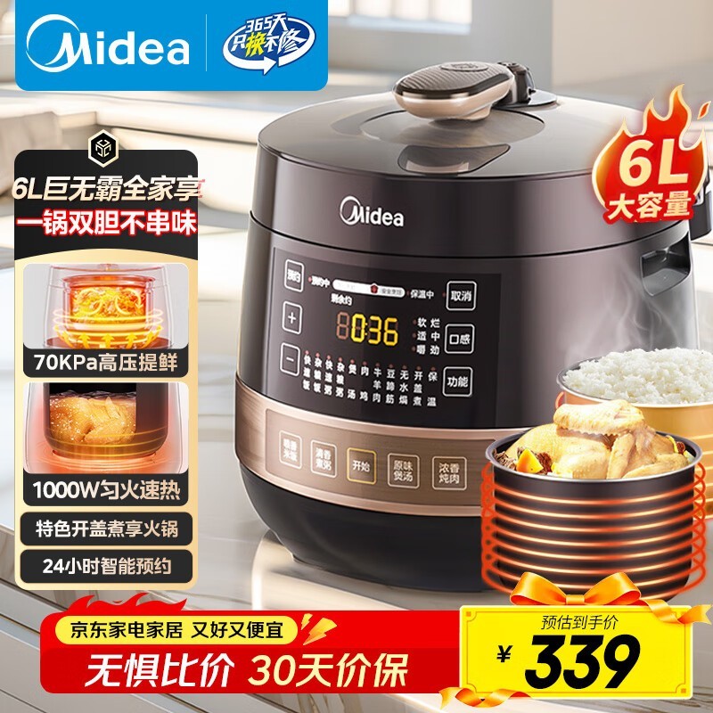 美的6升电压力锅优惠购,低至305元