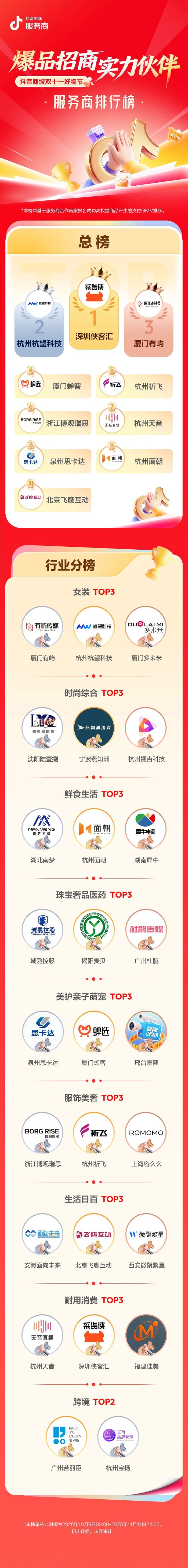 【亿邦原创】今日,抖音电商根据服务商合作商家产生的GMV进行排序,公布了双11的服务商排行总榜:第一名深圳格选(主要经营黄金珠宝类目,也是抖音水贝QIC仓合作企业)、第二名深圳侠客汇(主要经营数码类目)、第三名杭州杭望科技(主要经营女装类目)。