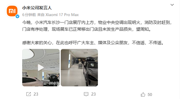 声明中称:今晚,小米汽车长沙一门店展厅内上方,物业中央空调出现明火,消防及时赶到,门店有序处理,现场展车已正常移出门店且未发生产品损失,望周知。