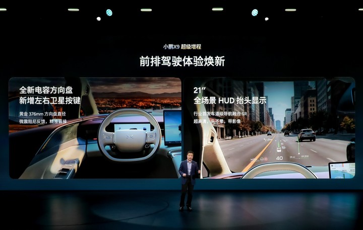 智能化方面,X9 超级增程搭载了全新的电容方向盘、21 英寸 W-HUD 以及一块 21.4 英寸的后排屏。