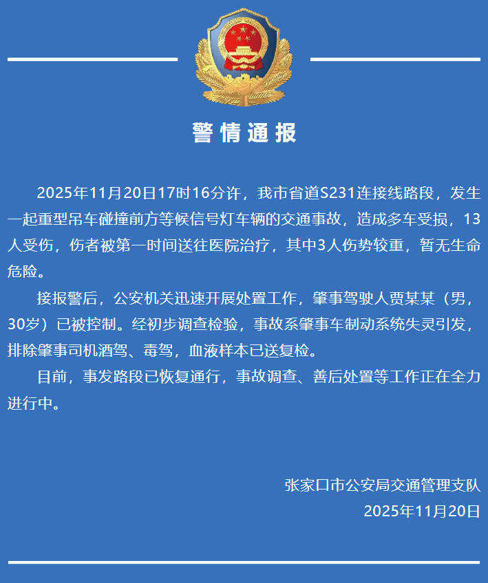 新京报讯 11月20日晚,张家口市公安局官方微信发布警情通报。
