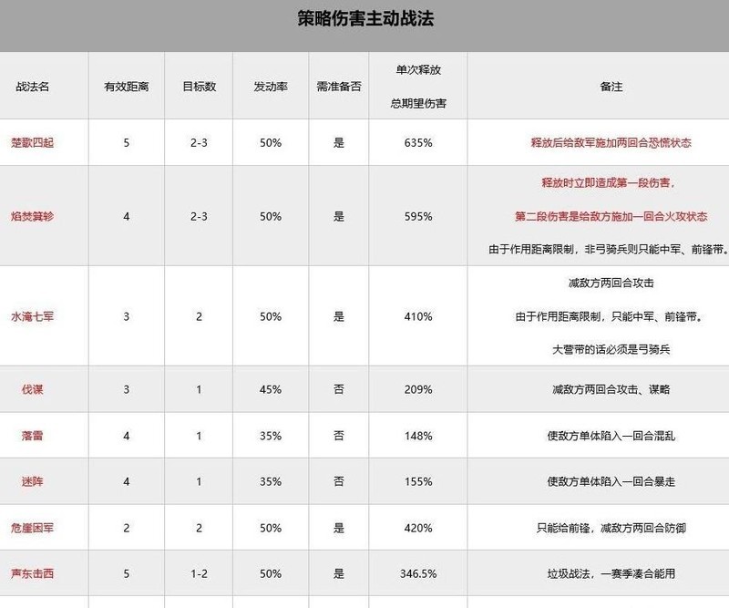该战法伤害突出,虽需准备但输出可观,缺点是仅限前锋位携带,且必须由谋略型武将担任,攻击范围和战法距离均限定为两人,位置和兵种要求较高。