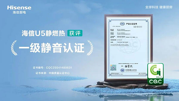 近日,海信厨电新发布的U5燃气热水器荣获中国质量认证中心颁发的一级静音认证。这一权威认证标志着海信厨电在静音技术领域继风眼U5静烟机之后的再一次突破,为用户打造静音舒适的健康厨房体验再添重磅砝码。