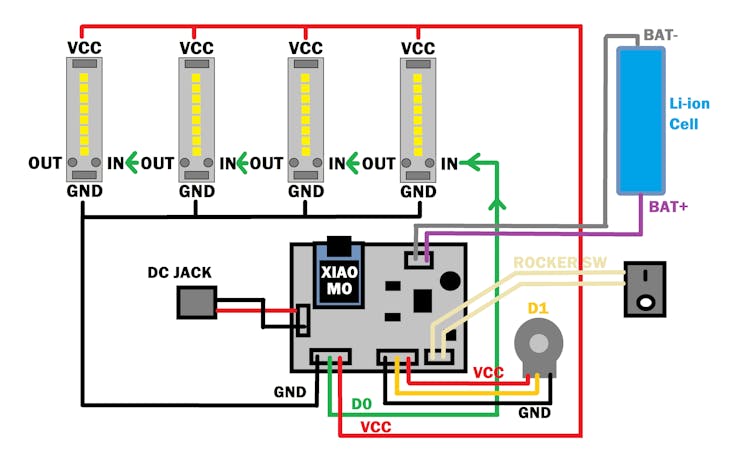 由 IP5306 升压至 5V,为 XIAO 与 LED 供电