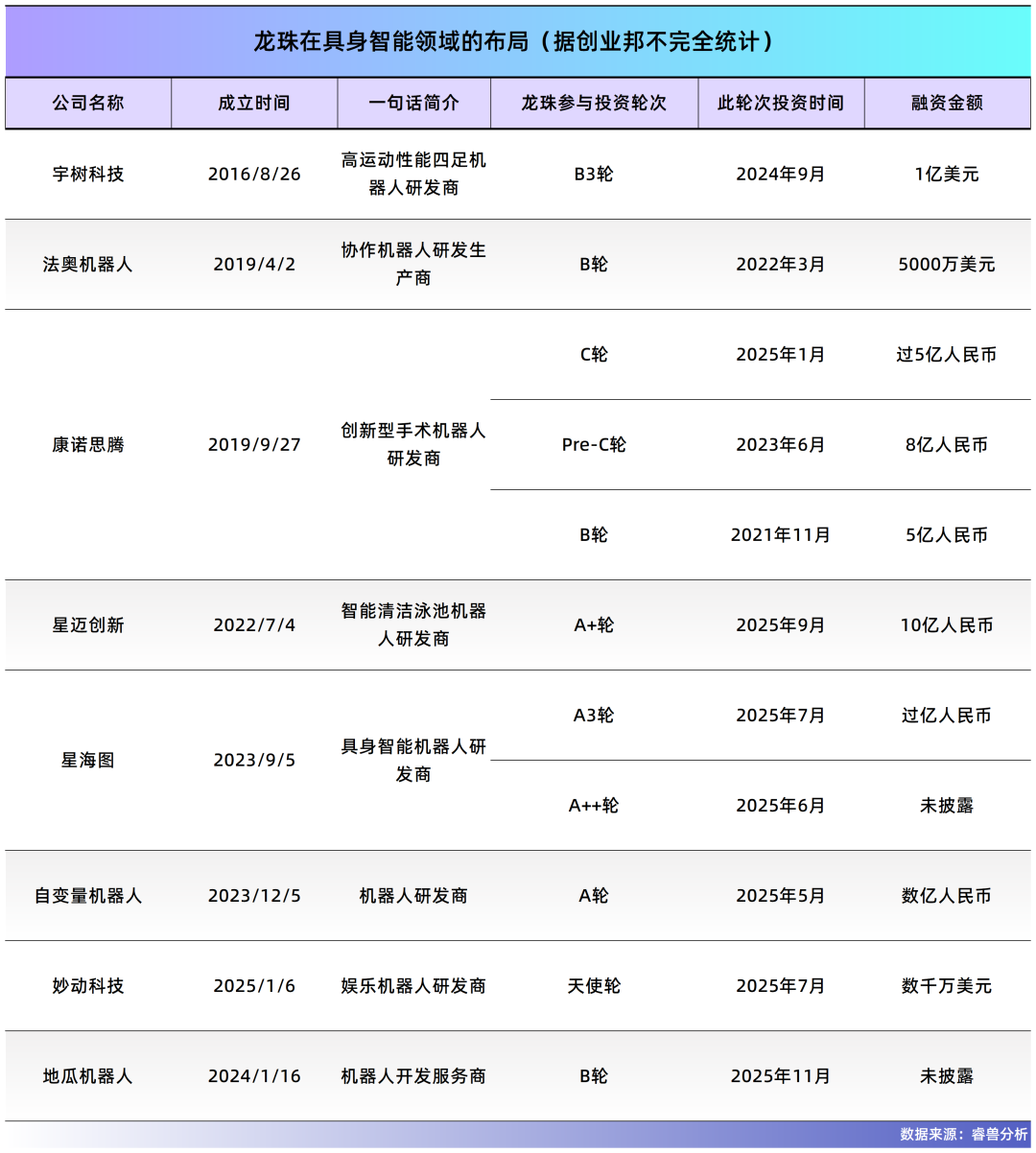 美团和龙珠在中国机器人产业投资领域属于布局较早、参与较为活跃的机构之一。