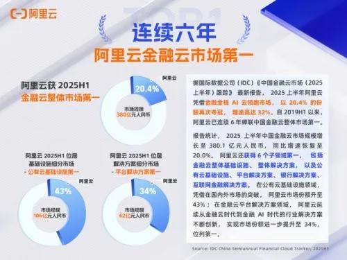 近日,据国际数据公司(IDC)《中国金融云市场(2025上半年)跟踪》最新报告,2025上半年阿里云凭借金融全栈AI云领跑市场,以20.4%的份额再次夺冠,增速高达32%。自2019H1以来,阿里云已连续6年蝉联中国金融云整体市场第一。