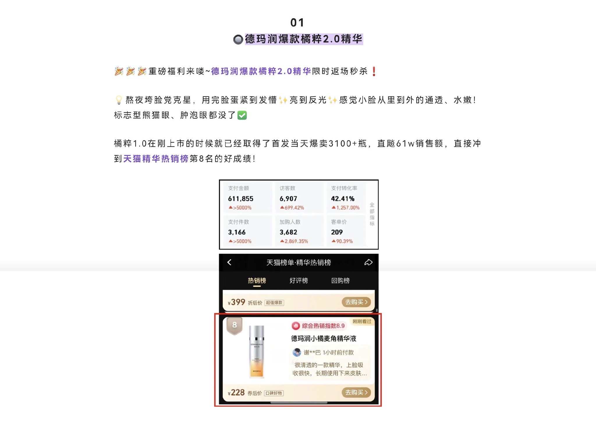 从该品牌的小红书官方账号内容来看,德玛润主推产品为“橘粹抗氧抗糖精华”,目前已推出2.0版本;此外还有精粹眼部精华、冻干保湿面膜等。其产品多主打抗氧化功效。在价格方面,2.0版橘粹精华(30ml)售价约为328元,而某竞品“双抗精华”售价为269元。