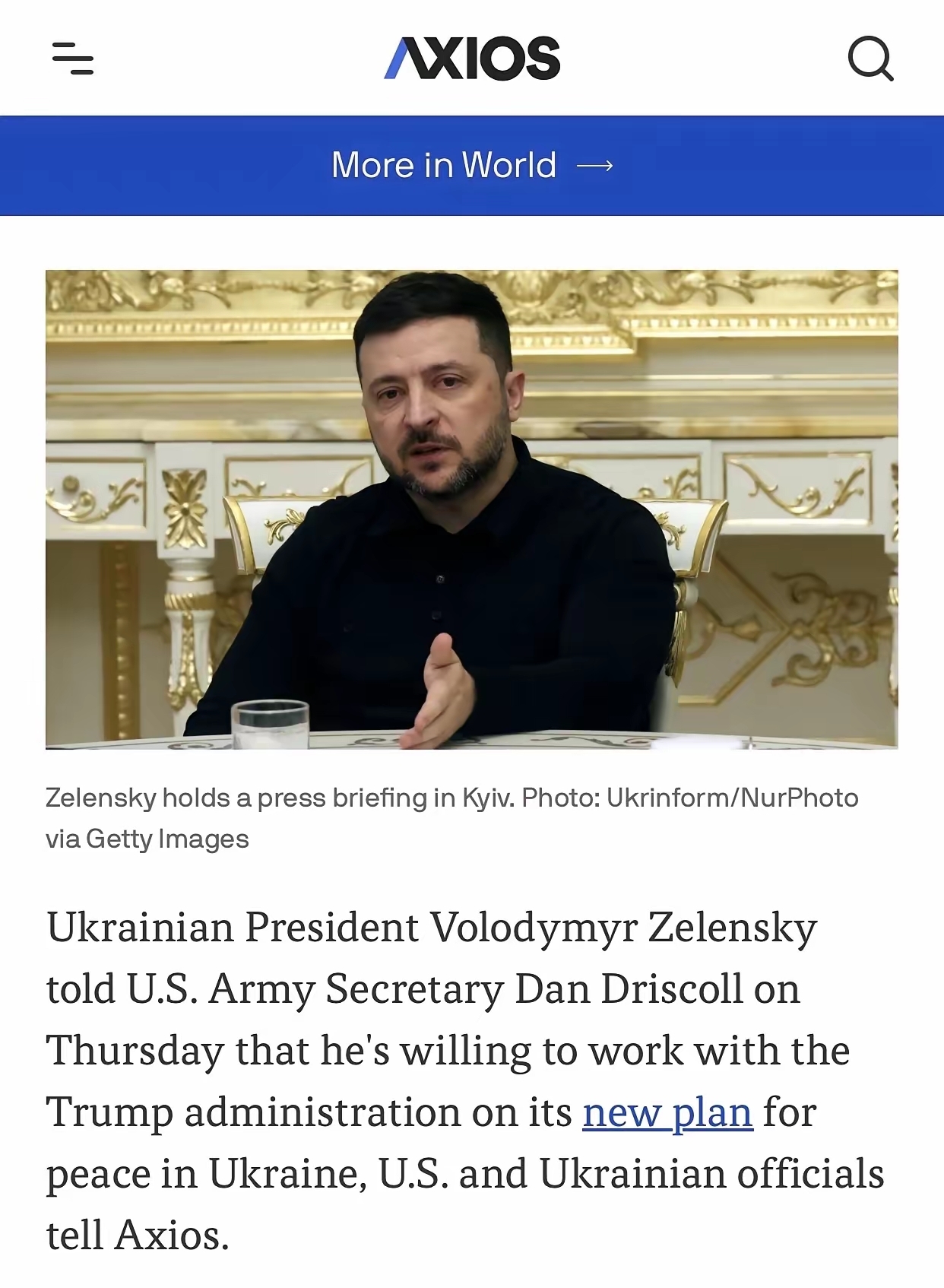 美国媒体Axios官网11月20日报道:据美国和乌克兰官员向Axios透露,乌克兰总统泽连斯基周四向美国陆军部长丹·德里斯科尔( U.S. Army Secretary Dan Driscol)表示,他愿意与特朗普政府就其新的乌克兰和平计划展开合作。
