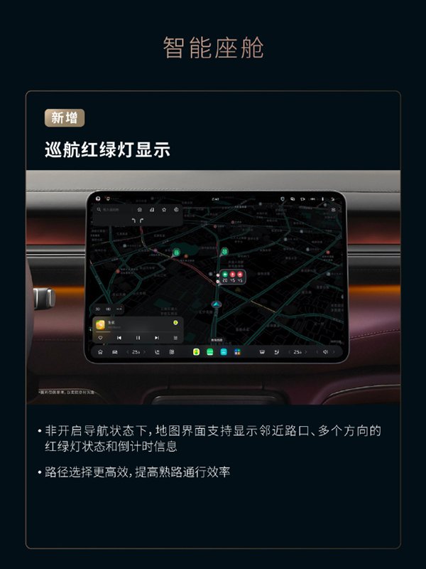 “巡航红绿灯显示”让非导航状态下的地图界面,也能显示邻近路口的红绿灯状态和倒计时,不用紧盯路口就能预判通行节奏。