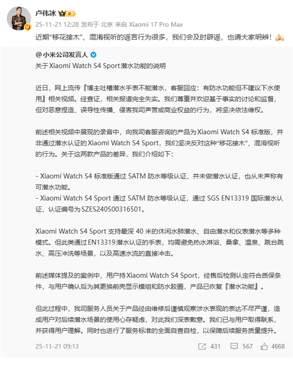 该录音实际上询问的是Xiaomi Watch S4 标准版产品,而并非是通过潜水认证的Xiaomi Watch S4 Sport,前者本身就未做潜水认证,也从未声称有可潜水功能。