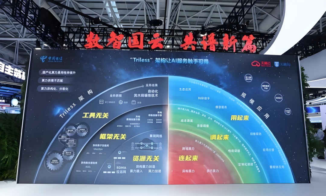 在平台架构方面,天翼云在“息壤”平台能力的基础上,进一步推出Triless架构,从“分层服务”走向“融合服务”。Triless是指“三个无关”,即资源无关、框架无关、工具无关,通过对用户屏蔽资源、框架和工具等底层技术,极大降低大模型应用服务门槛。
