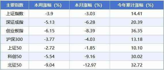本周(11月17日至11月21日),A股三大指数迎来大幅调整。截至周五收盘,上证指数累计下跌3.9%,深证成指累计下跌5.13%,创业板指累计下跌6.15%。