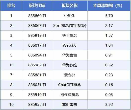 板块方面,本周涨幅居前的概念板块分别是中船系、Sora概念(文生视频)、快手概念、Web3.0,累计涨幅分别为5.7%、2.17%、1.57%、1.04%。