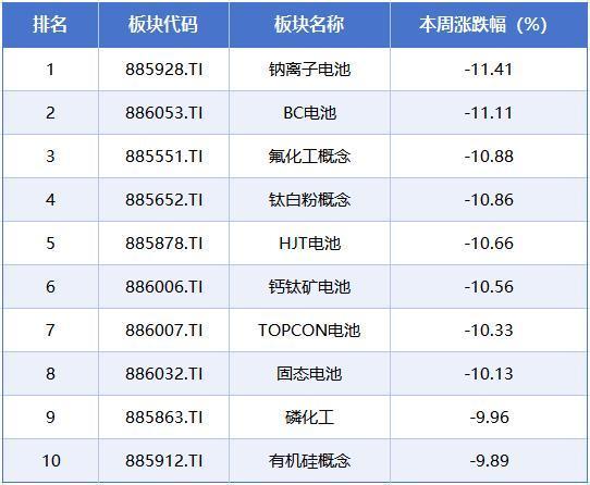 本周排在跌幅榜前排的概念板块分别是钠离子电池、BC电池、氟化工概念、钛白粉概念、HJT电池,累计跌幅分别为11.41%、11.11%、10.88%、10.86%、10.66%。