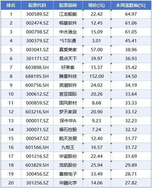 个股方面,本周个股涨幅榜前五位分别是江龙船艇、榕基软件、中水渔业、*ST东通、真爱美家,累计涨幅分别为64.97%、61.06%、61.05%、45.41%、38.96%。