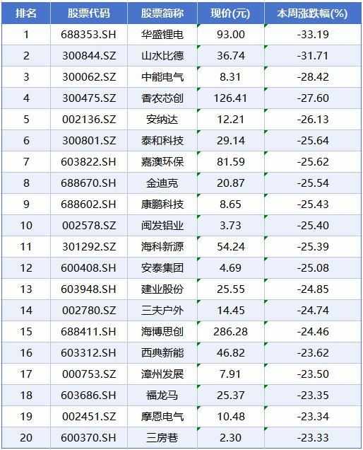 本周个股跌幅榜前五位分别是华盛锂电、山水比德、中能电气、香农芯创、安纳达,累计跌幅分别为33.19%、31.71%、28.42%、27.60%、26.13%。