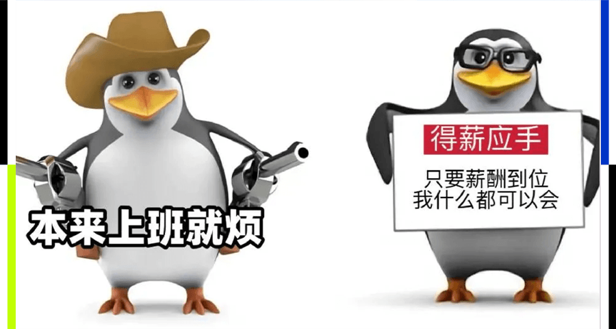 图片源自网络至此,高雅企鹅从一个普通的表情包,变身成情绪的赛博防弹衣。在高压的社会环境下,年轻人面临着学业内卷、职场PUA、社交焦虑等多重压力,过度抱怨会沦为负能量传播,而彻底躺平又心有不甘。