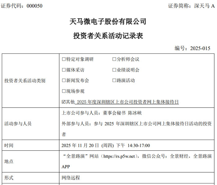 2025 年 11 月 20 日下午,天马微电子股份有限公司(证券简称:深天马 A)参与 2025 年度深圳辖区上市公司投资者网上集体接待日活动,董事会秘书陈冰峡通过网络远程形式,与广大投资者围绕技术研发、业务发展、市值管理等核心议题展开深入交流,全面回应市场关切。