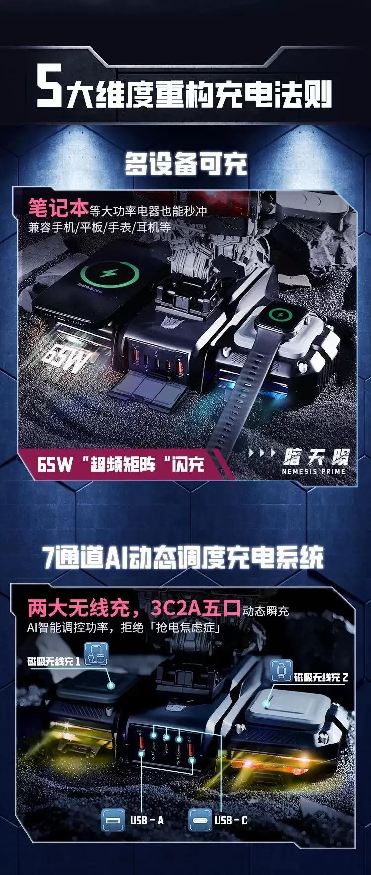 七通道智能调度,多设备同充无忧:配备7大充电通道,包括2个无线充和3个Type-C接口2个USB-A接口,满足您所有数码设备的充电需求。AI智能调度系统实时监控并动态分配功率,确保每个设备都能得到最合适的充电电流,彻底告别“抢电焦虑症”。