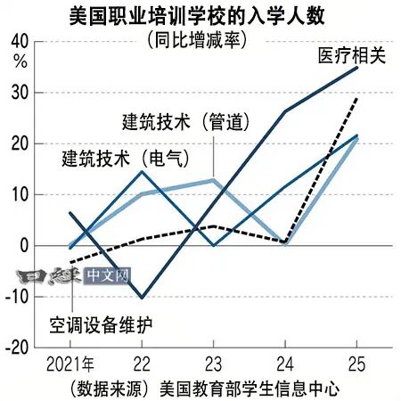 美国的就业状况正在发生变化。收集全美学生信息的美国教育部学生信息中心(National Student Clearinghouse)的数据显示,2025年春季,教授配管工、木匠等技术的职业培训学校的入学人数同比增长12%。远高于大学入学人数的增幅(4%)。