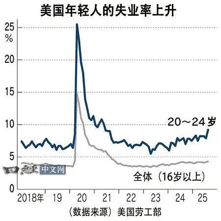 这种动向有其合理的理由。美国的失业率总体上稳定在4.0~4.5%区间,但如果仅限于大学毕业前后的“20~24岁”人群,失业率则从2024年12月的7.5%上升至2025年8月的9.2%。
