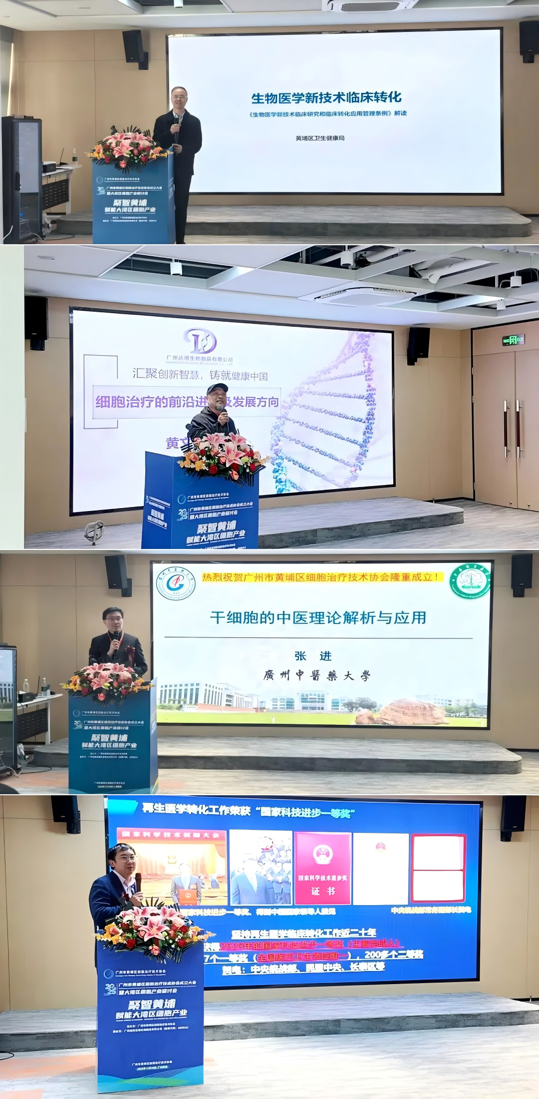 专家报告环节,区卫健局领导详细解读了我区细胞治疗相关产业的临床转化政策,广州达博生物制品有限公司董事长黄文林教授、广州中医药大学“干细胞与中医再生医学”团队负责任张进教授、中科睿极公司首席科学家张智勇博士分别作了“细胞治疗前沿进展”、“干细胞与中医理论融合”、“干细胞/外泌体生物智造平台临床转化”等精彩报告。