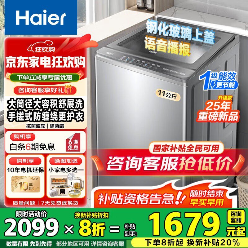 海尔波轮洗衣机直降,到手仅1583元