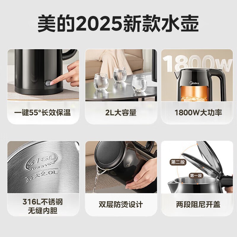 美的2L电热水壶,京东到手仅129元