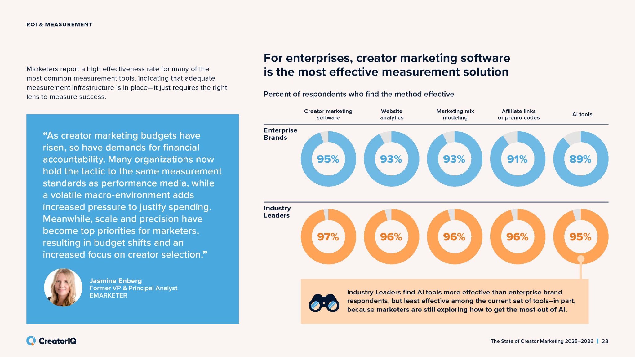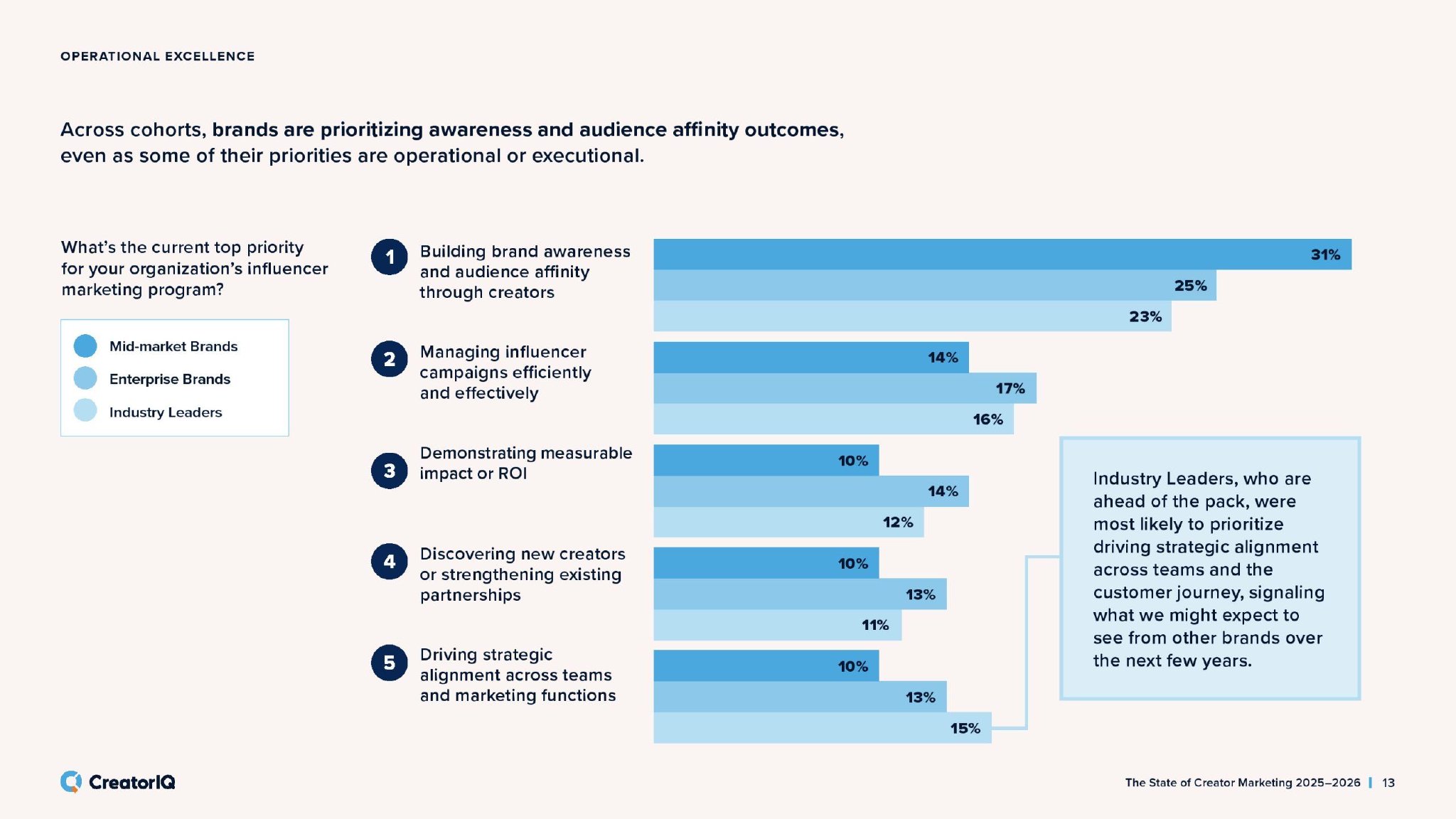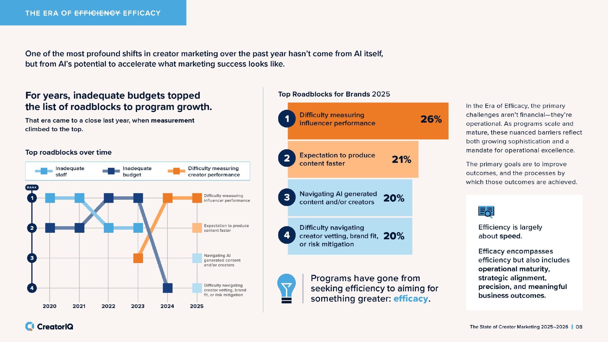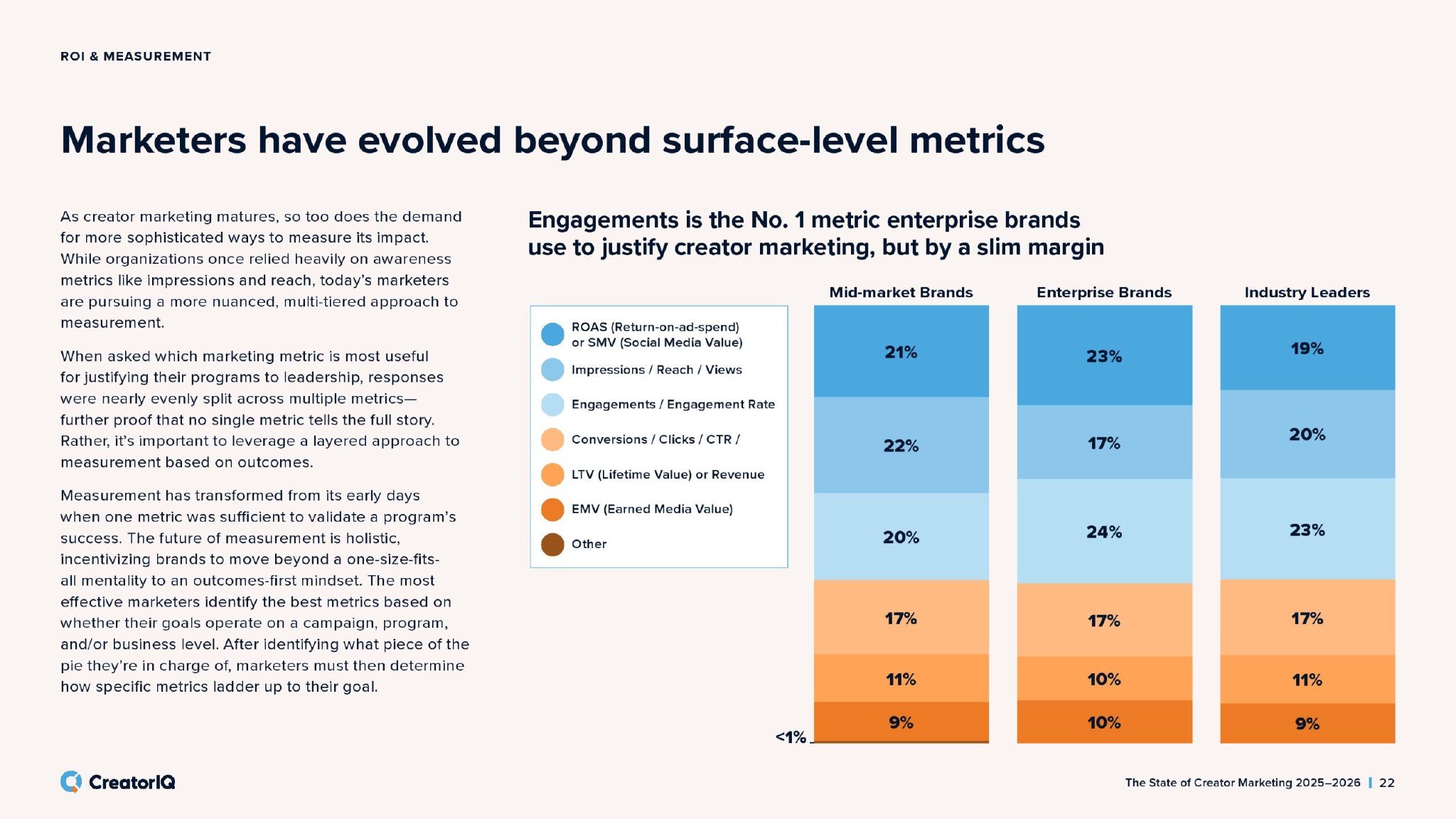 越来越多的首席营销官——如今比例已超过九成(91%)——认同品牌营销将更多地转变为品牌、创作者和平台之间的合作伙伴关系。根据CreatorIQ的一份报告,随着意见领袖合作模式不断发展以满足品牌需求,一个战略转变已经发生:”该行业长期以来对粉丝数量的执着正式宣告终结。”