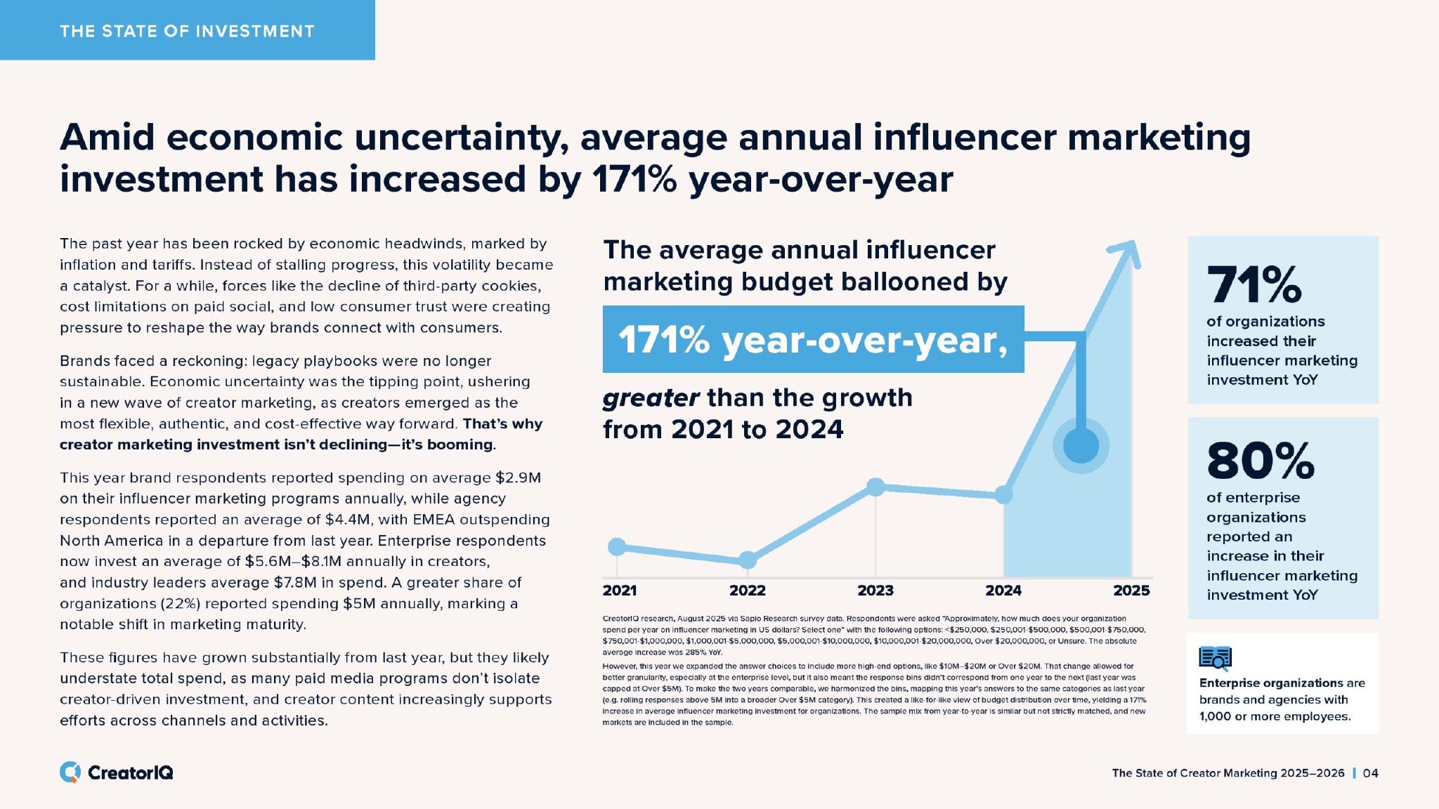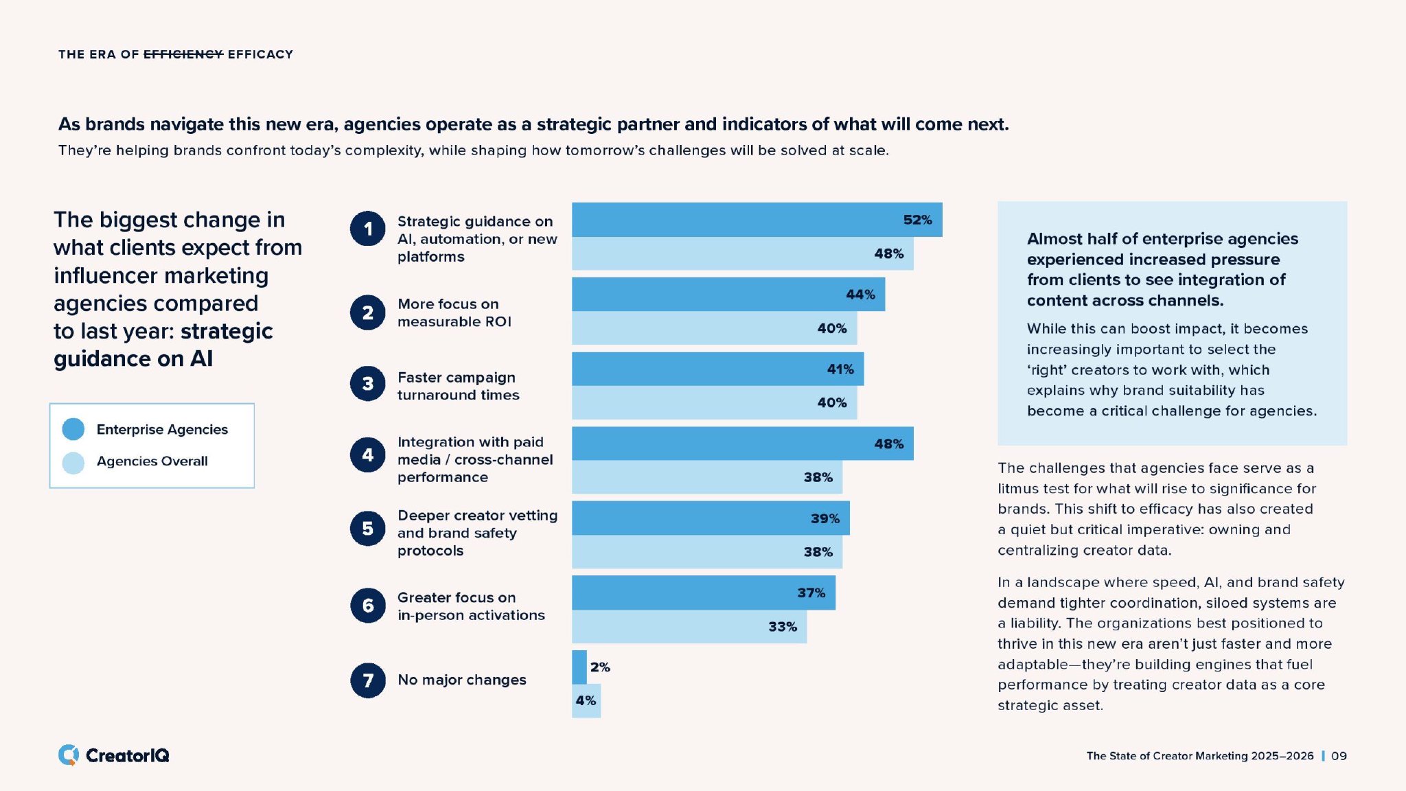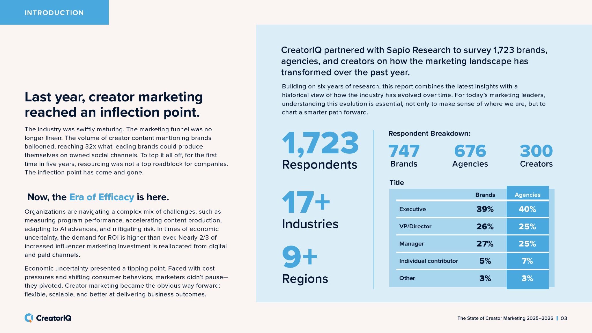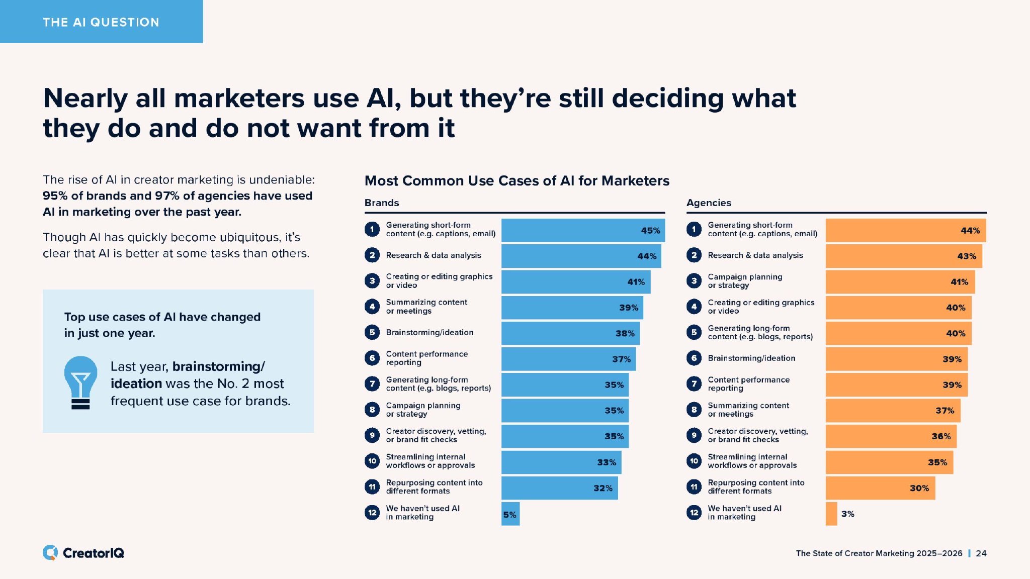 越来越多的首席营销官——如今比例已超过九成(91%)——认同品牌营销将更多地转变为品牌、创作者和平台之间的合作伙伴关系。根据CreatorIQ的一份报告,随着意见领袖合作模式不断发展以满足品牌需求,一个战略转变已经发生:”该行业长期以来对粉丝数量的执着正式宣告终结。”