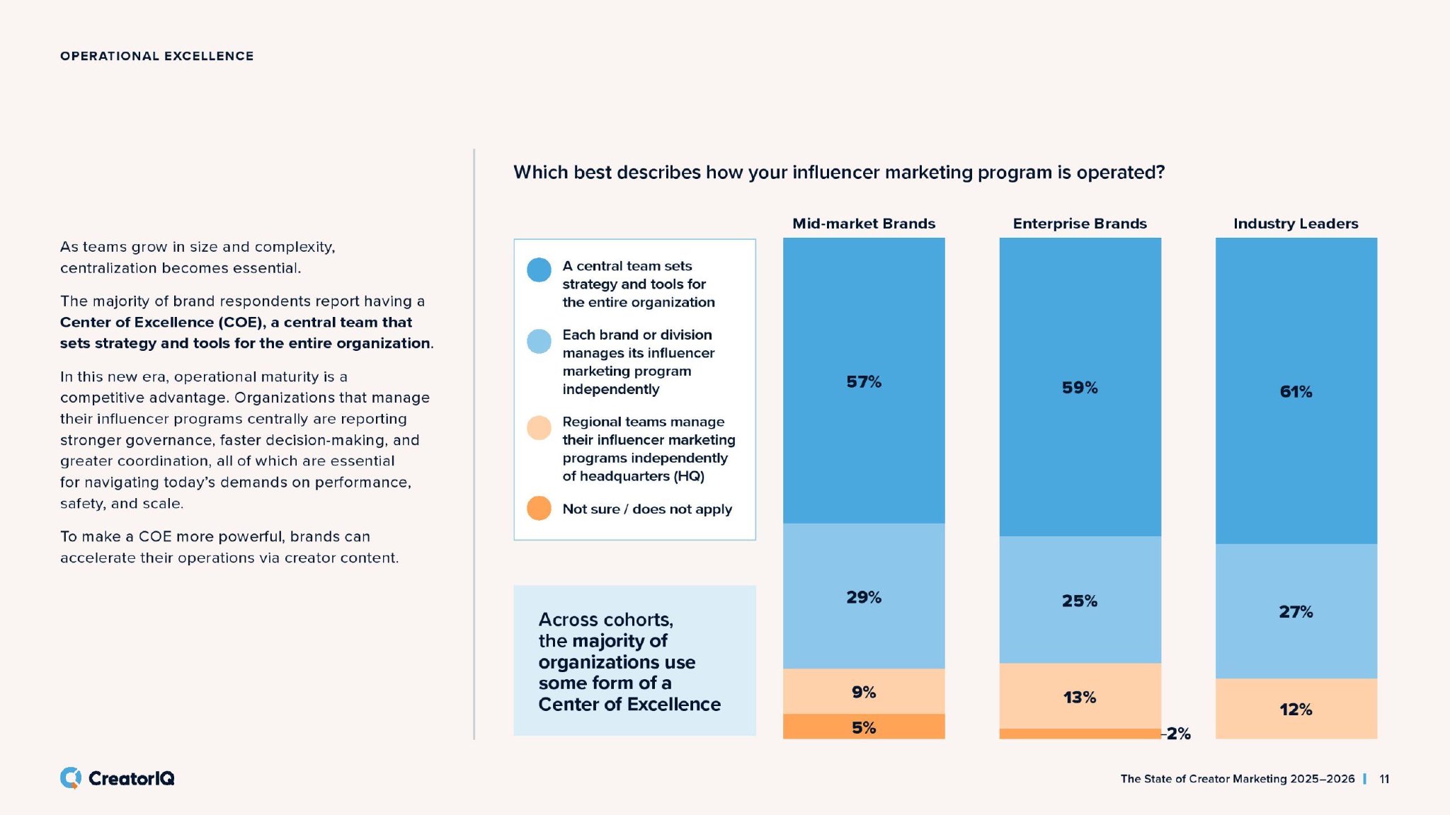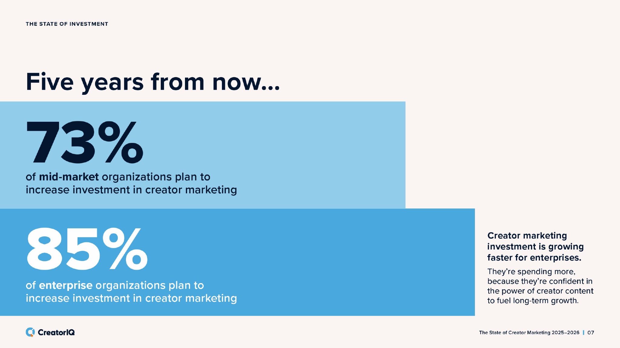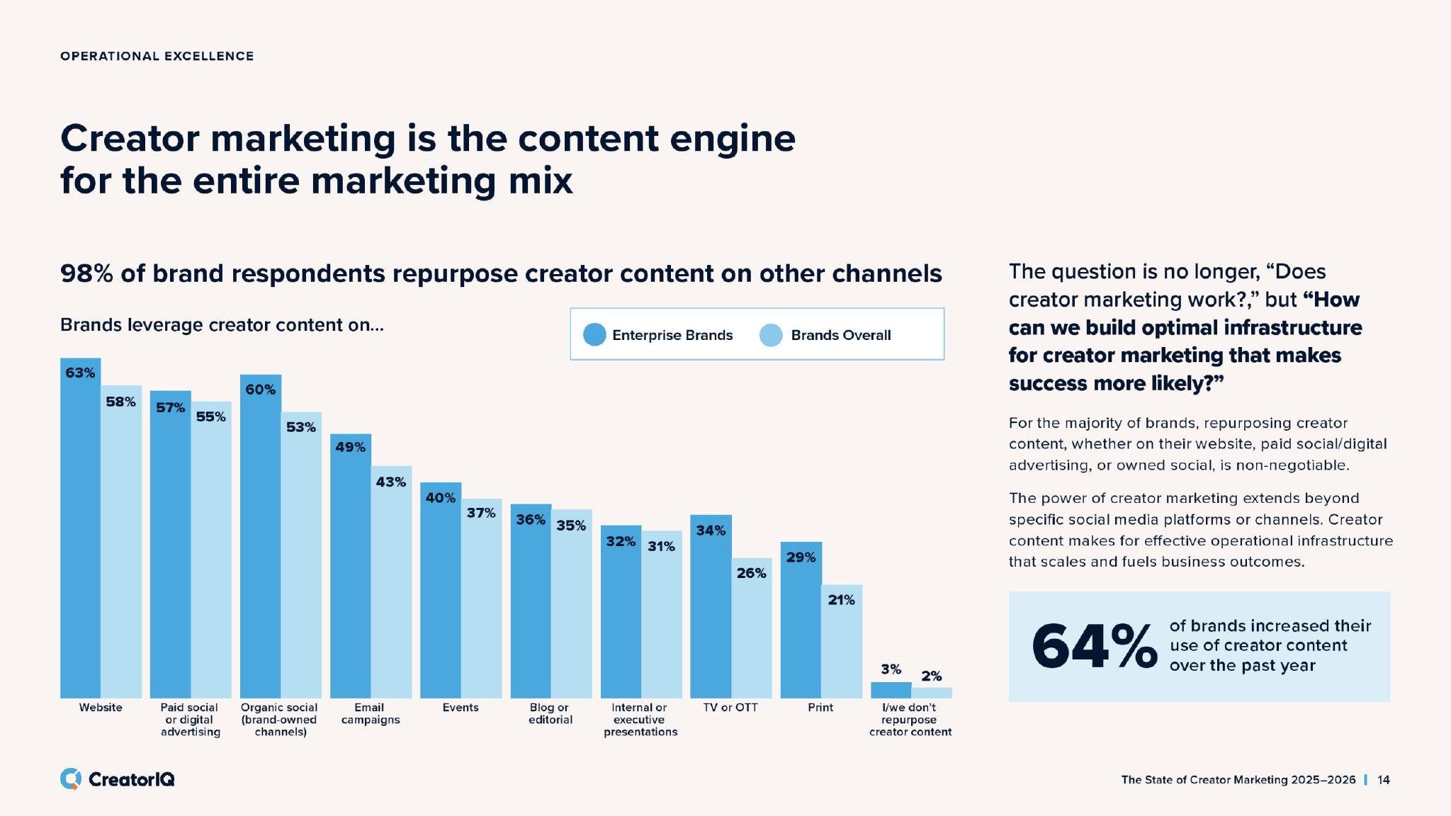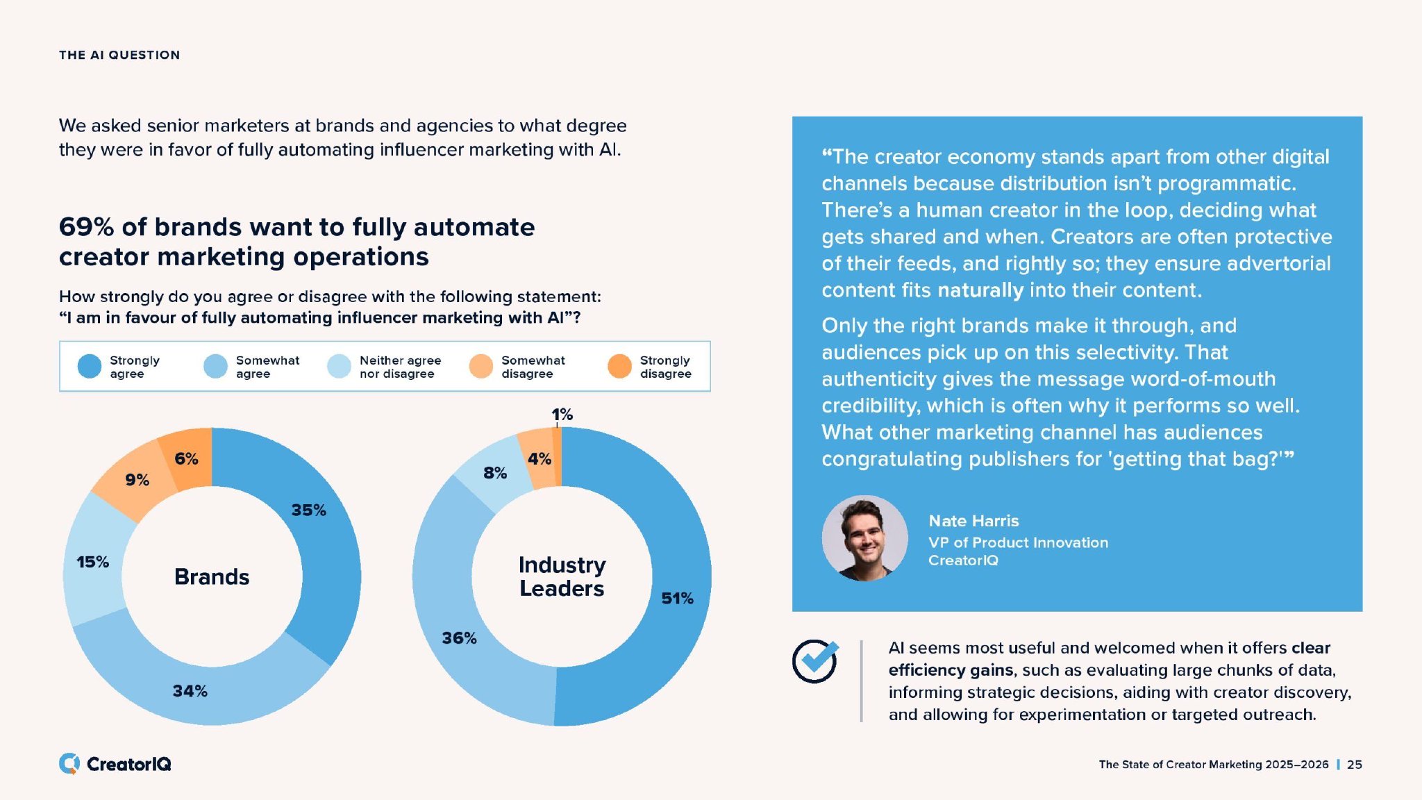 越来越多的首席营销官——如今比例已超过九成(91%)——认同品牌营销将更多地转变为品牌、创作者和平台之间的合作伙伴关系。根据CreatorIQ的一份报告,随着意见领袖合作模式不断发展以满足品牌需求,一个战略转变已经发生:”该行业长期以来对粉丝数量的执着正式宣告终结。”