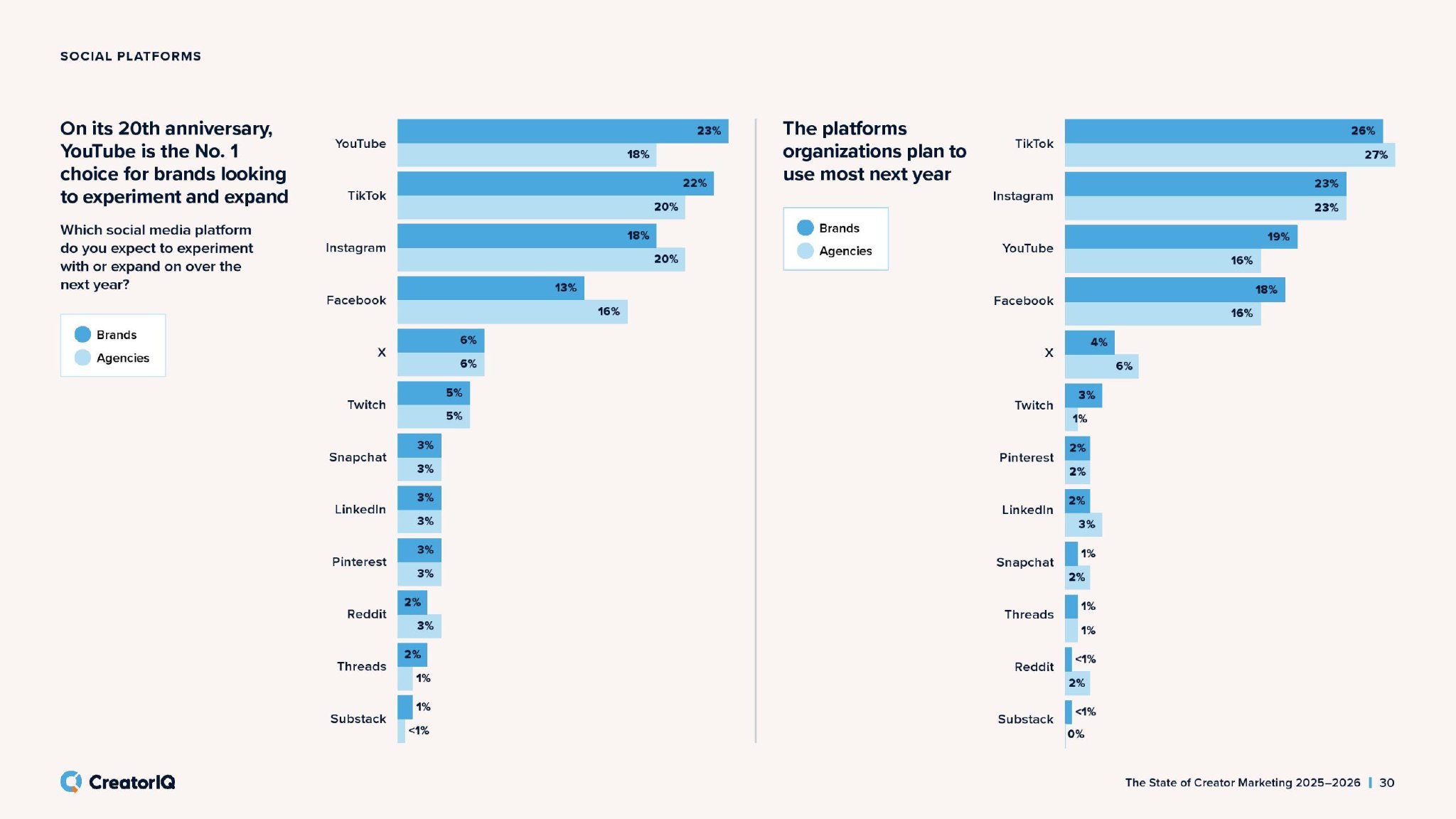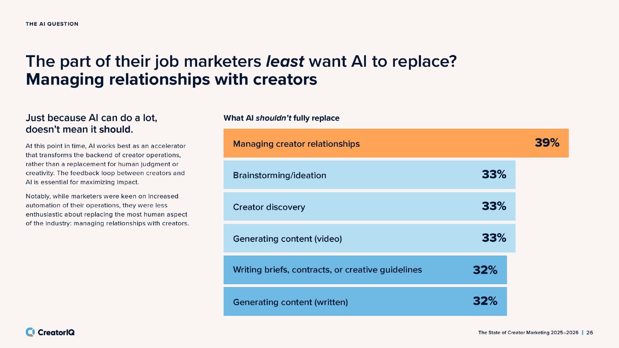 相反,对品牌而言最重要的是创作者的合适度或与品牌的契合度,22%的受访者指出了这一点。然而,在扩大合作规模时,保持这种契合度可能很困难:最近的一项研究发现,品牌在扩大创作者投资时面临的最大挑战是保持真实、高质量的内容和一致的品牌信息。