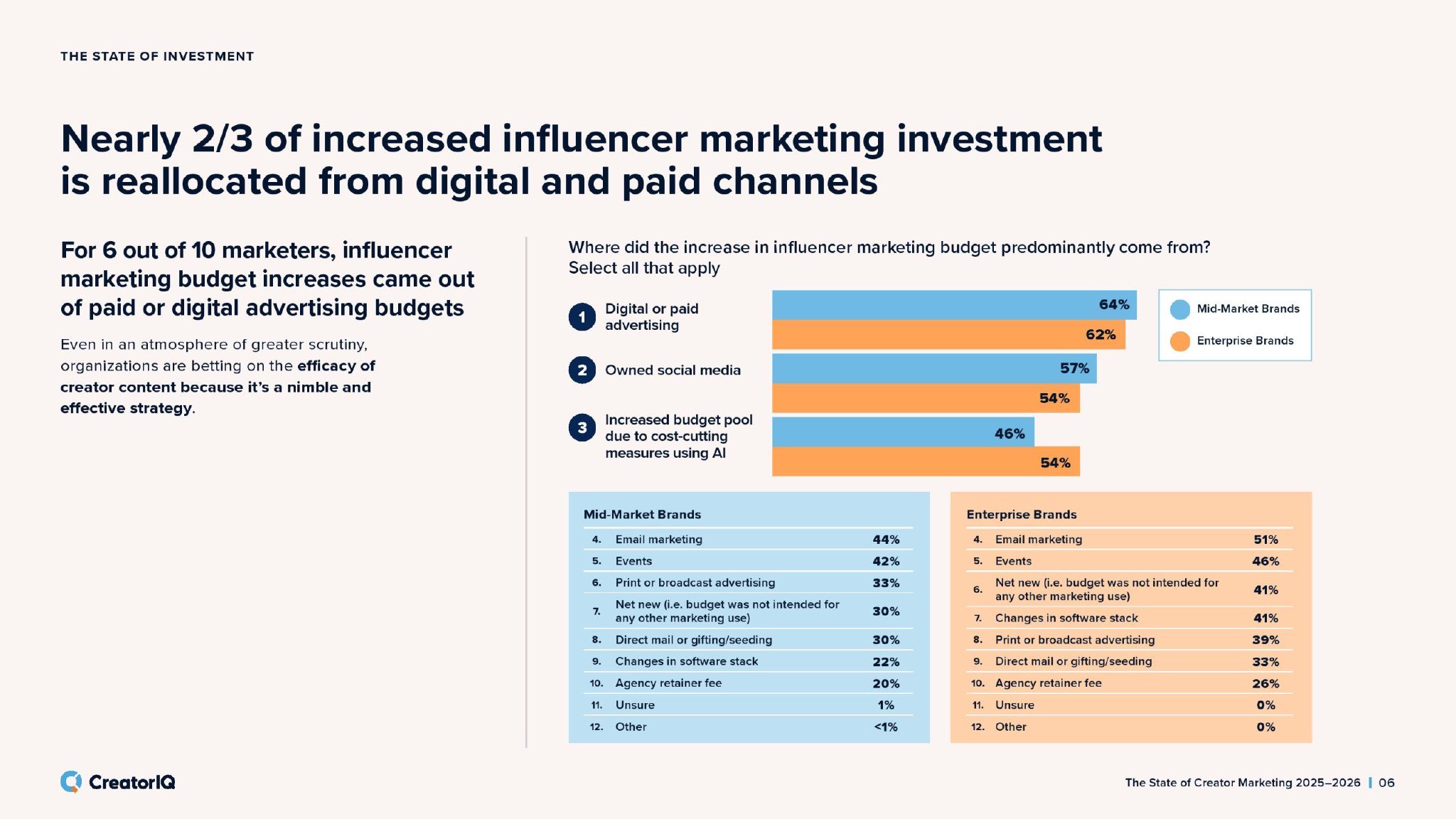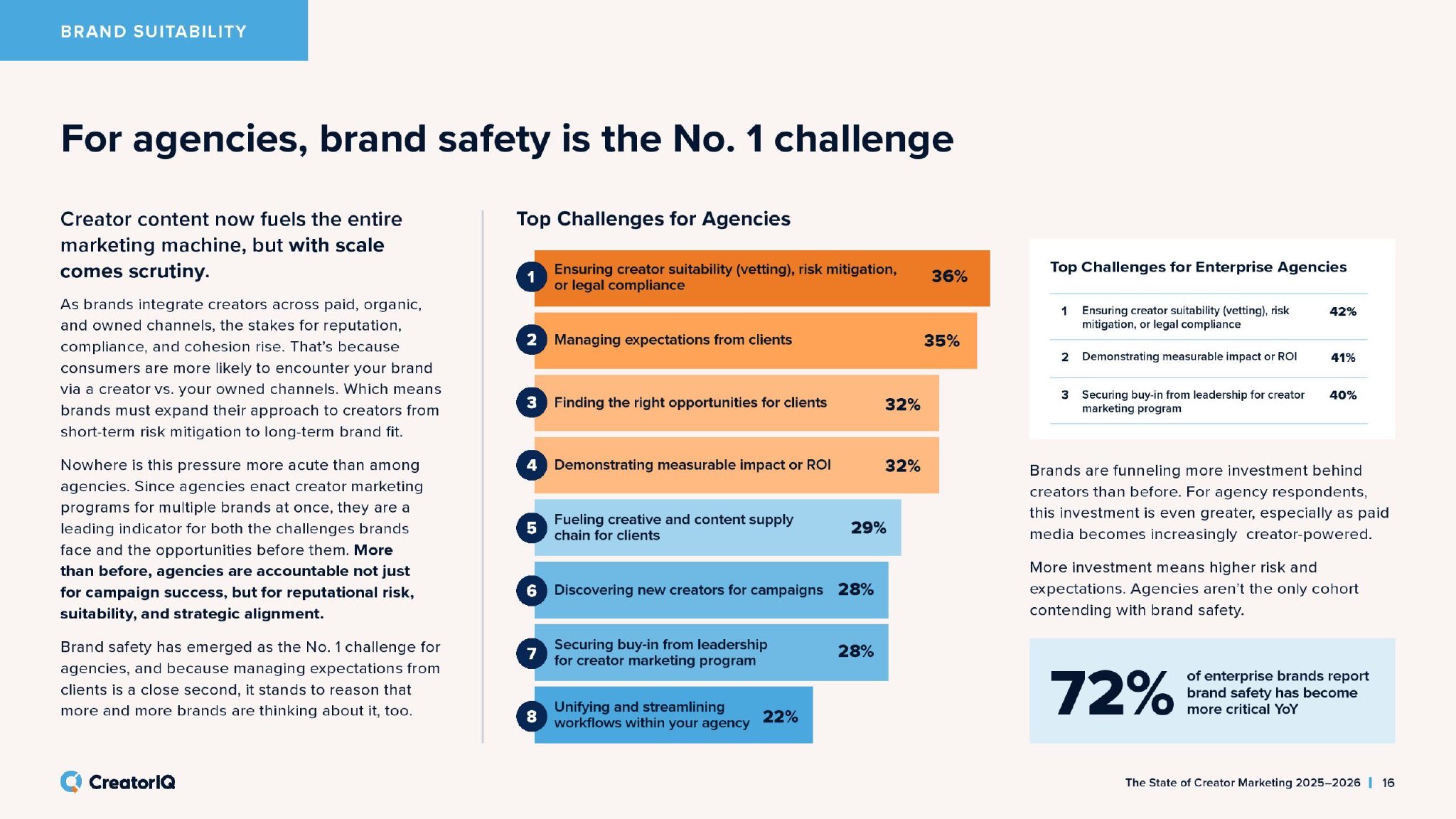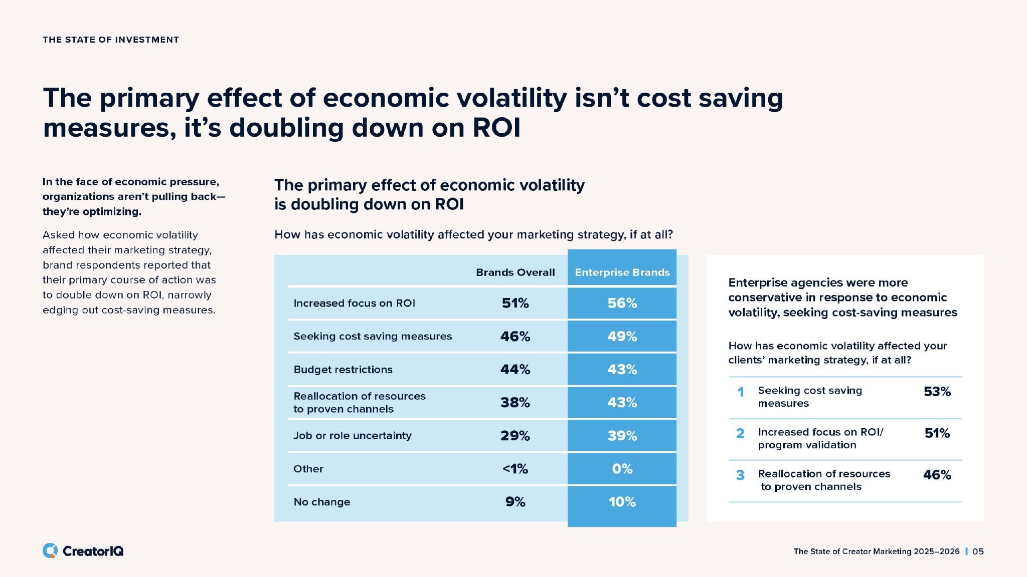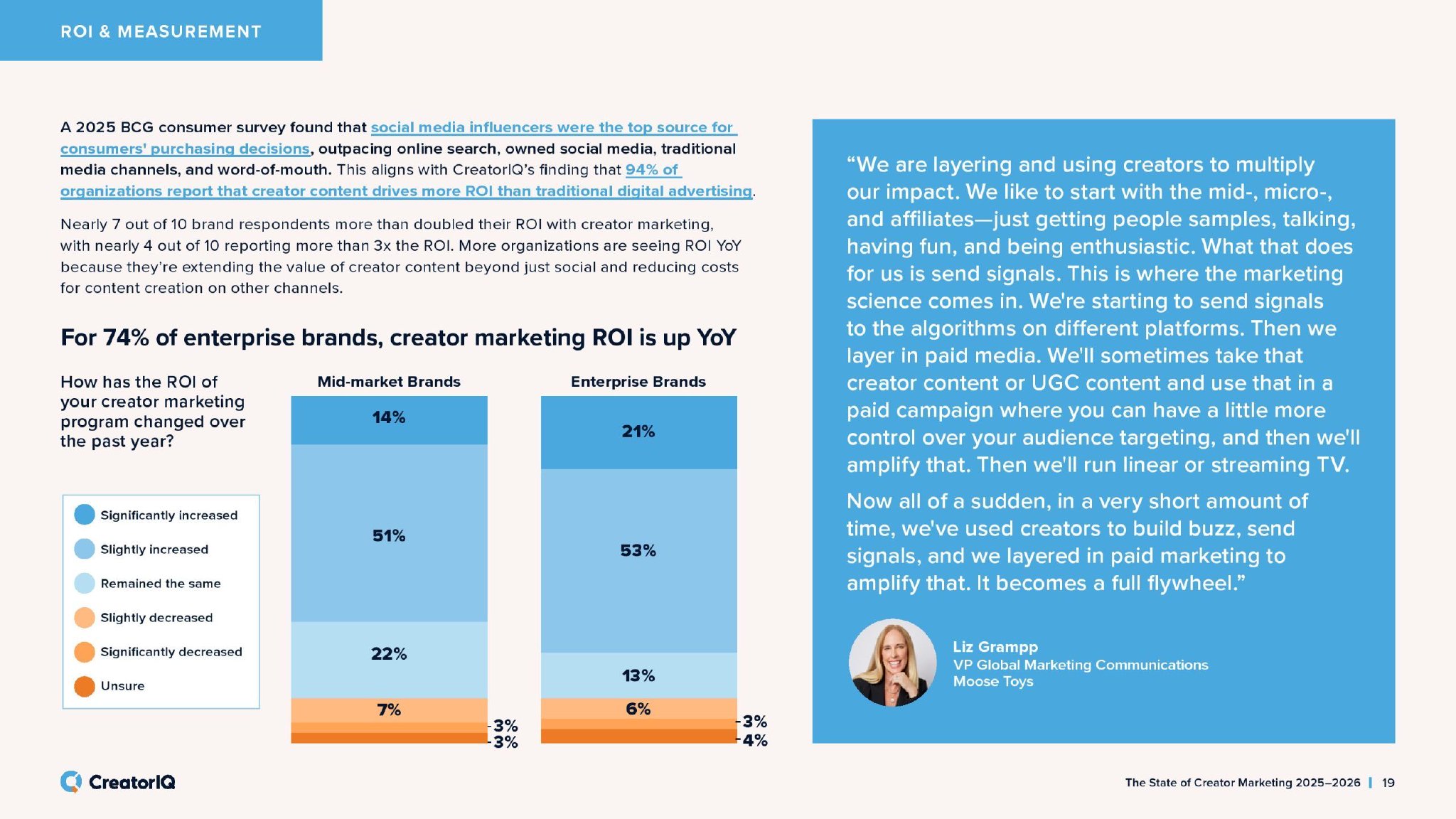 尽管如此,品牌安全显然是品牌最关心的问题,参与调查的代理商也将创作者合适度、风险缓解和法律合规性列为他们在创作者营销中面临的首要挑战。然而,除了审查创作者之外,投资回报率显然也至关重要,尤其是在经济波动时期。好消息是创作者营销的投资回报率似乎正在提高:65%的中型市场品牌表示,过去一年中其创作者营销项目的投资回报率显著(14%)或略有(51%)提高,74%的大型企业品牌也持相同看法(分别有21%和53%)。