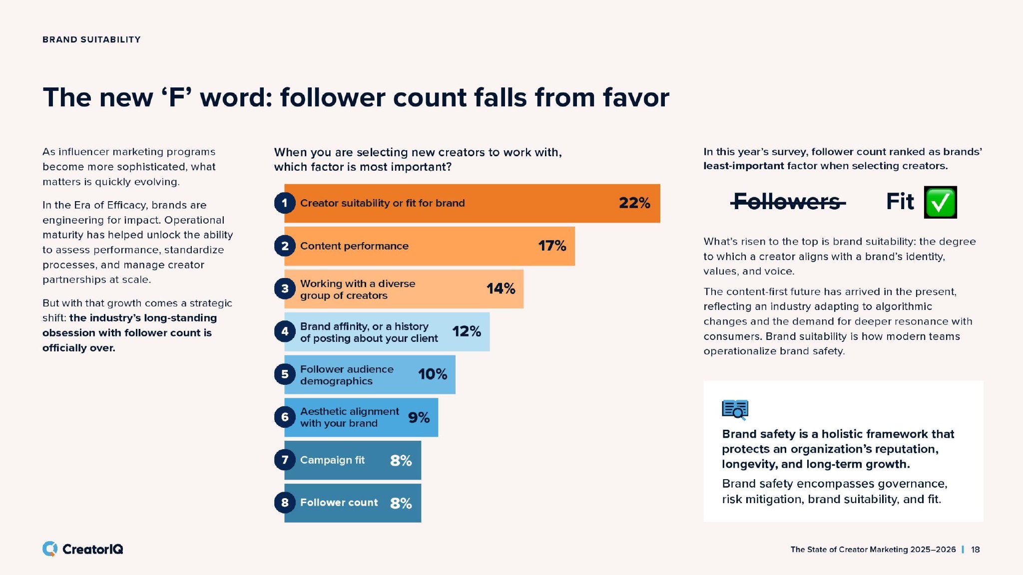 事实上,当被问及在选择新的创作者进行合作时考虑的最重要因素时,仅有8%的品牌提及粉丝数量。这是在给出的8个选项中选择率最低的之一。