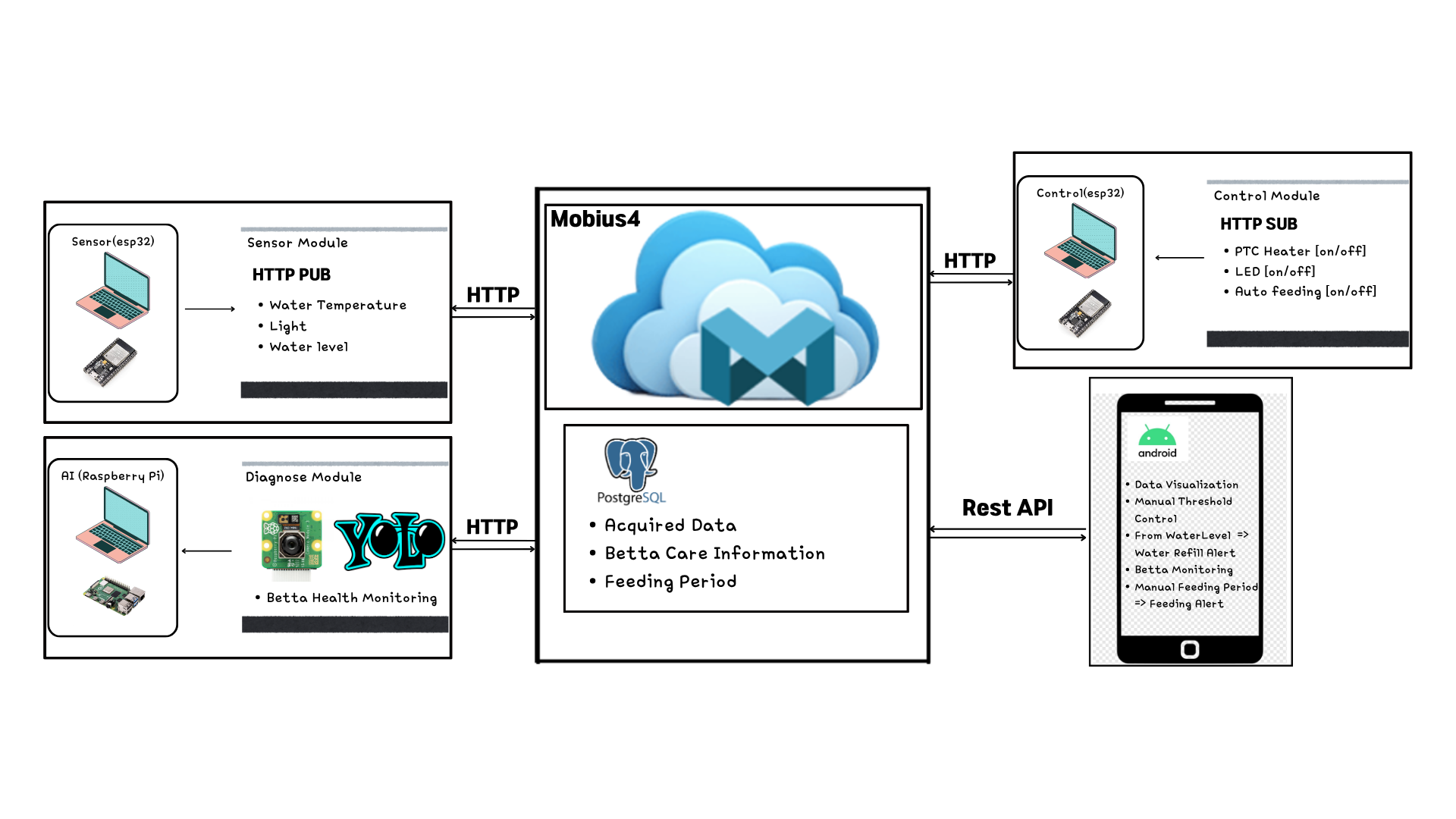 本项目构建了一个“全自动智能水族箱系统”。系统以 oneM2M/Mobius 作为核心 IoT 数据枢纽,通过 ESP32 负责环境数据采集与执行器控制,Raspberry Pi 执行鱼类疾病检测 AI 模型,Python 逻辑服务器进行规则判定与自动化,Android 应用提供用户交互界面。
