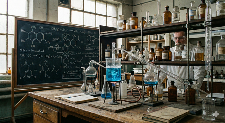 烧杯里的液体会有正确的弯液面;玻璃器皿对光线的折射符合物理直觉;最重要的是,背景黑板上的分子式不再是乱画的线条,而是看上去像模像样化学结构的式子(虽然还是有瑕疵)。