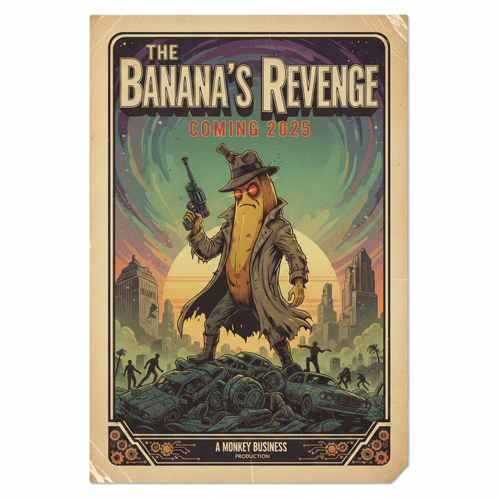我的随手测试「生成一张复古电影海报,标题是《香蕉的复仇》,副标题用红色衬线体写 2025 年上映。」