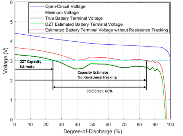 为了在电池的整个使用寿命期间提供超高精度的荷电状态计算,跟踪电阻至关重要。如图 5 所示,电池电芯的电阻随电池的循环和老化而线性增加,直到达到某个拐点,从该拐点开始,电阻将呈指数级增加,直到电池寿命结束。该电阻也会随温度变化而显著波动。电池电芯电阻与温度成反比关系,温度越低,电阻越高,电池在达到 0% 荷电状态之前可提供的容量或能量便越低。